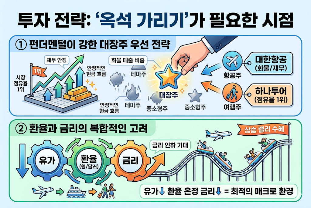 테마주 장세일수록 펀더멘털이 확실한 종목을 골라야 합니다. 항공주 중에서는 화물 매출 비중이 높고 재무 구조가 안정적인 대한항공을, 여행주 중에서는 시장 점유율 1위를 공고히 하고 있는 하나투어를 중심으로 포트폴리오를 구성하는 것이 안전합니다. 중소형주는 유가 하락 시 탄력은 좋지만, 반대로 리스크 발생 시 하락 폭도 크기 때문입니다. 안정적인 배당 수익이나 기업의 현금 흐름을 체크하여, 일시적인 유가 변동에도 흔들리지 않을 기업을 선별하는 것이 이번 투자 성패의 핵심입니다.