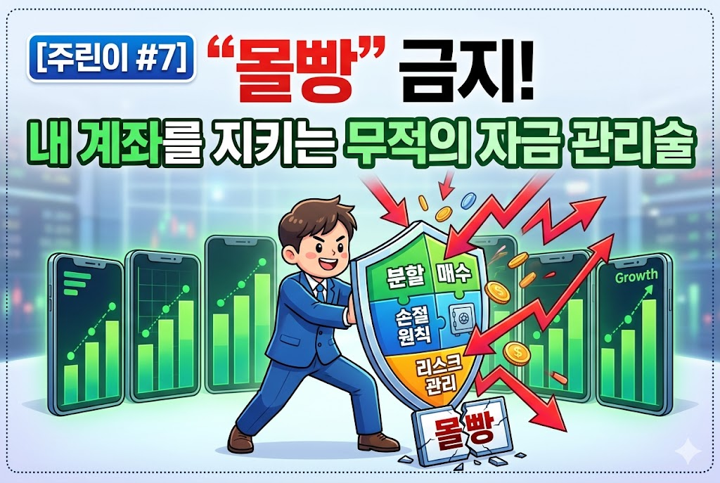 "내가 사면 떨어지고, 내가 팔면 오르는" 지독한 머피의 법칙에 시달리고 계신가요? 많은 주린이들이 차트 분석이나 종목 발굴에는 열을 올리지만, 정작 내 돈을 어떻게 나누고 지킬지에 대한 '자금 관리'에는 소홀하곤 합니다. 주식 시장이라는 거친 파도 위에서 우리를 지켜주는 것은 화려한 돛(수익 기법)이 아니라 튼튼한 구명정(자금 관리)입니다. 준비되지 않은 '몰빵' 투자는 한 번의 실수로 모든 기회를 앗아가지만, 철저한 원칙에 기반한 분할 투자는 위기를 기회로 바꾸는 마법을 부립니다. 오늘 7회차에서는 단순히 돈을 버는 법이 아니라, 어떤 폭풍우가 몰아쳐도 내 소중한 자산을 안전하게 방어하고 심리적 우위를 점할 수 있는 '투자의 방패'를 제작해 보겠습니다.