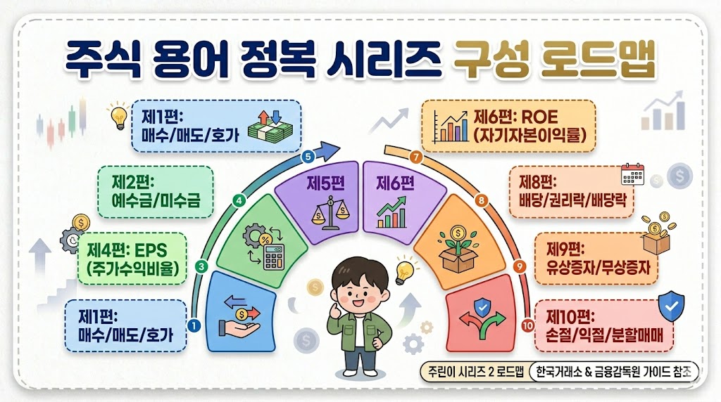 주식 투자를 처음 시작하면 마치 외국에 떨어진 것처럼 모든 단어가 낯설게 느껴집니다. "PER이 낮아서 저평가다", "권리락 때문에 주가가 떨어졌다" 같은 말들이 외계어처럼 들린다면, 아직 시장의 대화에 참여할 준비가 되지 않은 것입니다. 하지만 걱정 마세요. 우리가 일상에서 물건을 사고팔 때 가격을 흥정하고 품질을 따지듯, 주식 용어들도 결국 '이 회사가 얼마짜리인지', '지금 사는 게 유리한지'를 설명하는 약속일 뿐입니다. 이번 시리즈에서는 주린이가 가장 헷갈려 하는 10가지 테마를 선정하여, 단순히 뜻을 외우는 것을 넘어 실전에서 어떻게 해석해야 하는지 그 맥락을 짚어드리고자 합니다. 이 10단계의 여정을 마치고 나면, 여러분은 증권사 리포트와 경제 뉴스를 자신 있게 읽어 내려가는 스스로를 발견하게 될 것입니다.📊 [상세] 주식 용어 정복 10편 가이드