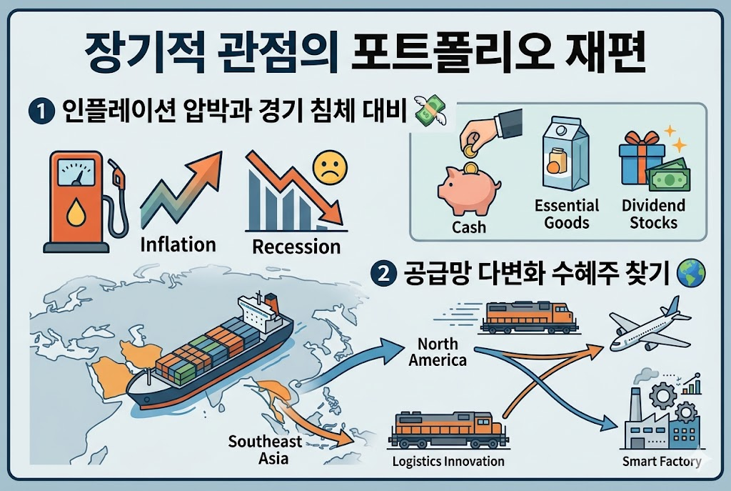 유가 급등은 필연적으로 인플레이션을 유발하고, 이는 중앙은행의 금리 인상을 부추길 수 있습니다. 고금리와 고물가는 가계 소비를 위축시켜 결국 모든 기업의 이익을 갉아먹는 경기 침체(Recession)를 불러옵니다. 따라서 호르무즈 해협 봉쇄가 3개월 이상 장기화될 조짐이 보인다면, 공격적인 투자보다는 현금 비중을 늘리고 필수 소비재나 배당주 같은 방어적인 포트폴리오로 대피하는 전략이 유효합니다. 위기 상황에서는 '얼마를 버느냐'보다 '어떻게 지키느냐'가 자산 관리에서 더 중요합니다.
