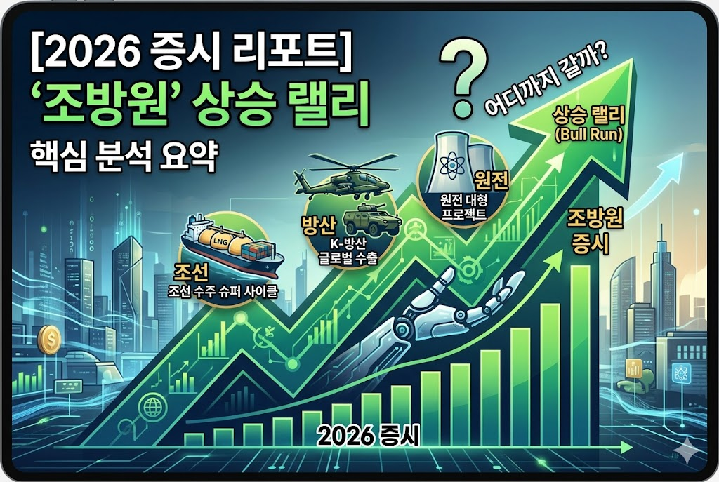 최근 투자자들 사이에서 "반도체는 쉬어도 조방원은 안 쉰다"는 말이 돌 정도로 이 세 섹터의 기세가 무섭습니다. 2025년 하반기부터 시작된 상승세는 2026년 들어 더욱 견고해졌으며, 단순한 기대감이 아닌 '숫자(실적)'로 증명되는 구간에 진입했습니다. 급변하는 글로벌 정세 속에서 대한민국을 먹여 살릴 '조방원'의 호재가 과연 언제까지 지속될지, 각 카테고리별 정밀 분석과 대응 전략을 통해 미래 수익의 기회를 포착해 보시기 바랍니다. 🌟