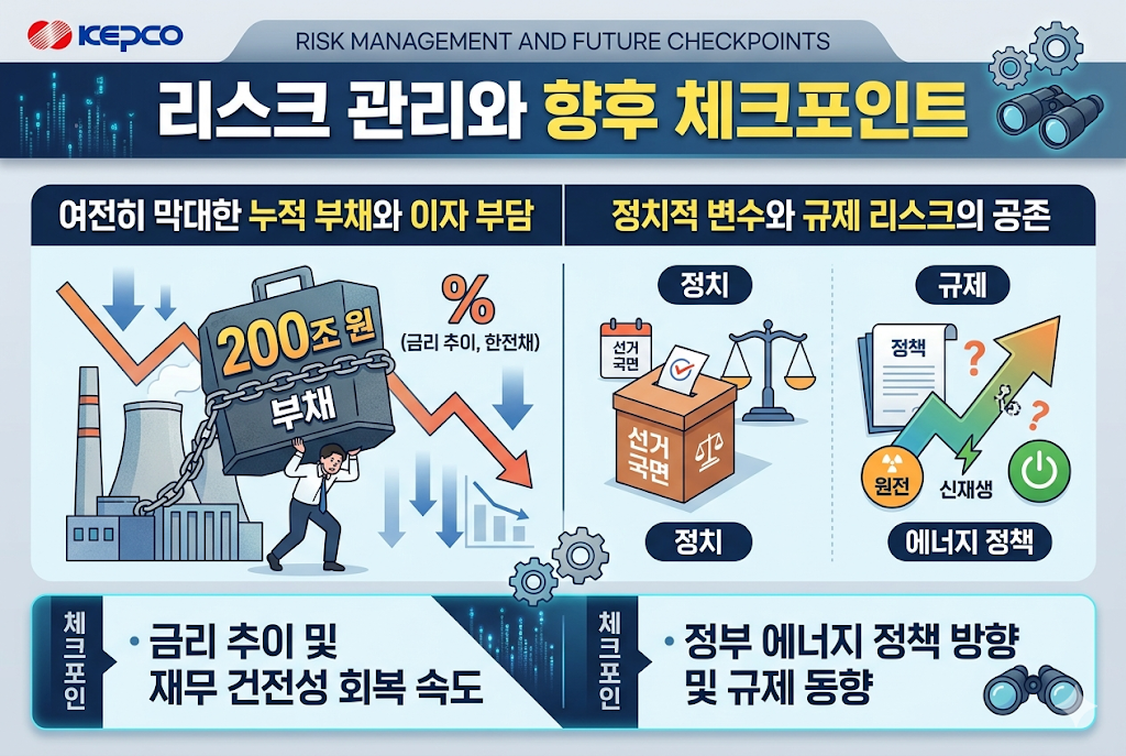 장밋빛 전망 속에서도 잊지 말아야 할 것은 200조 원에 달하는 총부채입니다. 매년 지출되는 막대한 이자 비용은 여전히 한전의 어깨를 무겁게 하고 있습니다. 아무리 영업이익이 잘 나와도 부채 상환 압박이 지속된다면 공격적인 투자나 배당 확대에 제약이 생길 수밖에 없습니다. 따라서 금리 추이와 한전채 발행 규모 등을 면밀히 살피며 재무 건전성이 실제로 얼마나 빠르게 회복되는지 지켜보는 혜안이 필요합니다.