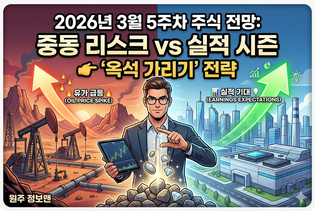 안녕하세요! 여러분의 투자 파트너 주린이 주식학교장입니다. 어느덧 3월의 마지막 주, 완연한 봄기운과는 달리 주식 시장은 중동발 훈풍 대신 '강풍'이 불고 있습니다. 호르무즈 해협의 긴장감이 고조되면서 유가는 요동치고, 금리 인하 기대감은 안갯속으로 사라졌죠. 하지만 위기 뒤에는 늘 보석 같은 기회가 숨어있기 마련입니다. 이번 주에는 단순한 테마주 추격이 아닌, AI 시대의 실질적인 수혜주와 인플레이션을 방어할 가치주를 동시에 살펴봐야 합니다. 3월 5주차, 여러분의 계좌를 붉게 물들일 핵심 공략집을 지금 바로 공개합니다!